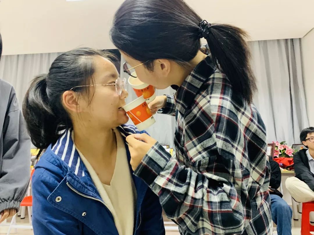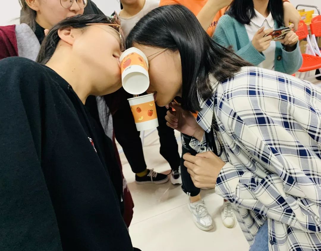 每人嘴叼一只纸杯往后传水传到最后水最多的组胜出