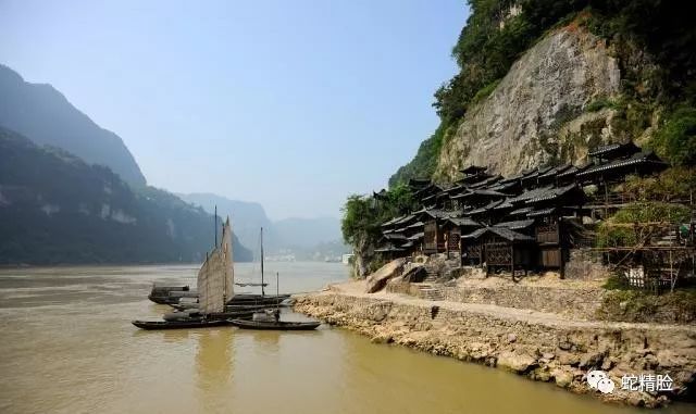 船只继续行驶,到达三峡人家时可看到一艘艘古帆船及乌篷船停靠三峡人家门前,旁边一座座纯木结构的吊脚楼错落有致依山而建,细看还可以看到“纤夫”的雕塑身影,原先这里有纤夫拉船这项工作,为了纪念在此设置了雕塑。