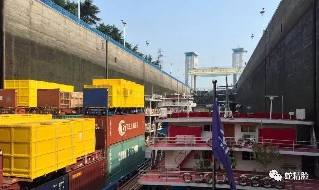 船只差不多行驶1小时30分钟,便抵达了葛洲坝,作为长江上第一座大型水电站,终于一睹其容貌,更是感受了“水涨船高”的智慧所在。船只进入预定位置后,两侧闸口关闭并开始蓄水,期间船只随着水量增多不断上升。