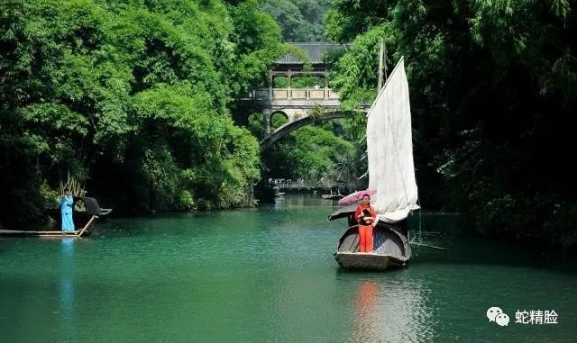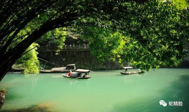 走进景区内,仿佛进入了另外一个世界,一条碧绿的溪流映入眼帘,这条溪流叫龙进溪,碧绿的溪水与橙黄的江水有着鲜明的对比。一艘帆船及竹筏停泊在溪水之上,似乎在欢迎着每一个来到这里的人。