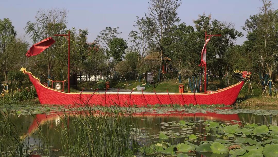 赛龙舟、包棕子是后人为纪念屈原自发举办的活动,展园借用龙舟概念建成“龙舟平台”来表达对屈原的追忆之情,通过翻越“问天”平台、穿过亲水栈道等重重阻隔到达龙舟平台,提升游客参与性与体验性,同时表达后人对屈原不惧险阻,上下求索精神的深深敬意。