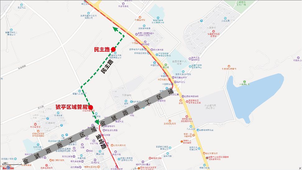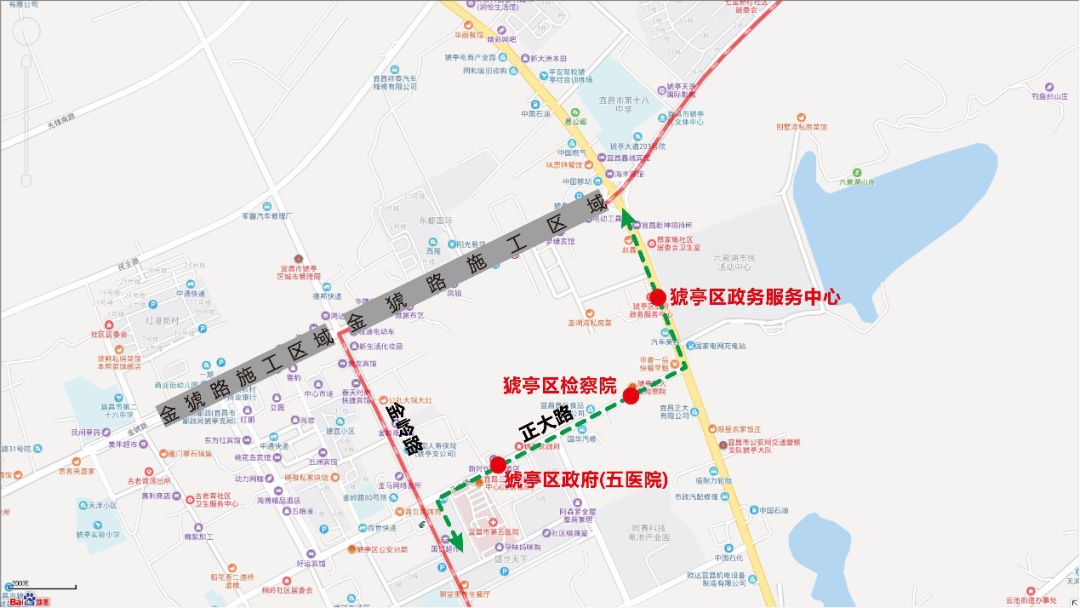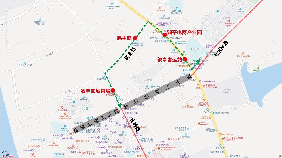 (四)88路:★首末站和首末班时间不变,在施工区域路段临时调整为由七里冲路经猇亭大道、民主路至金岭路往返运行。★临时增设猇亭客运站(上、下行)、猇亭电商产业园(上、下行)、民主路(上、下行)、猇亭区城管局(上、下行)等8个站点;临时取消东都国际(上、下行)、猇亭区邮政局(上、下行)、中心市场(金猇路上、下行)等6个站点;其它路段运行线路和站点不变。