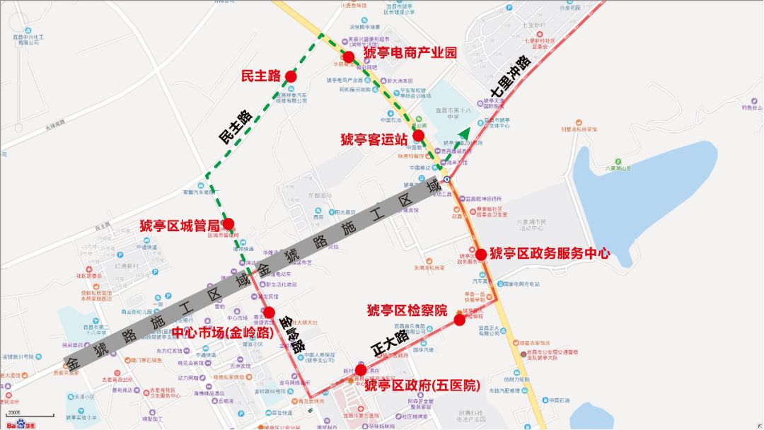 ★临时增设猇亭区政务服务中心(下行)、猇亭区检察院(下行)、猇亭区政府(下行)、中心市场(金岭路下行)、猇亭区城管局(上行)、民主路(上行)、猇亭电商产业园(上行)、猇亭客运站(上行)等8个站点;临时取消猇亭区邮政局(上行)、中心市场(上行)等2个站点;其它路段运行线路和站点不变。