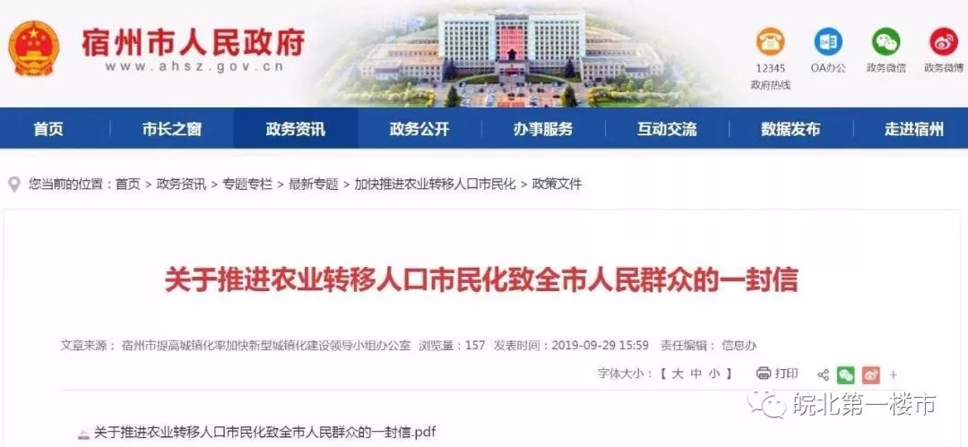 10月8日,苏州发布《关于推进农业转移人口市民化致全市人民群众的一封信》。宿州市全面放开城镇落户,取消一切门槛。