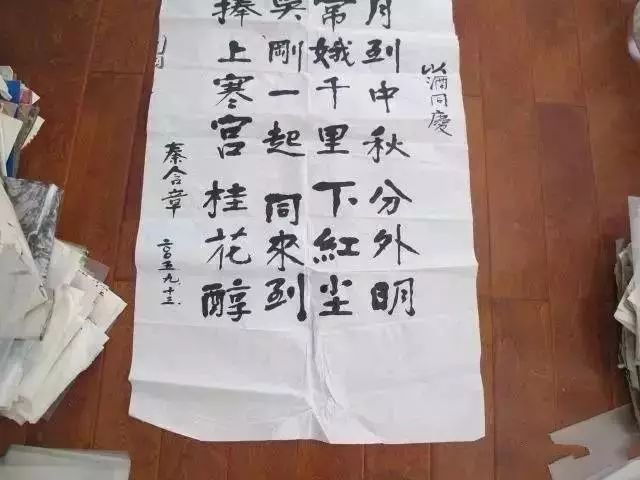 写毛笔字的全套活儿都由他一个人完成,拿小毛毯铺桌子,去另一个房间拿宣纸、铺宣纸、折宣纸,研墨等,这一连串的动作,行云流水。