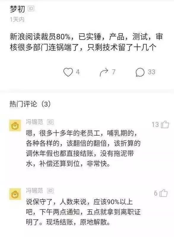 近日,据脉脉网友爆料称,新浪阅读业务线裁员90%,下午两点通知,五点就拿到了离职证明,赔偿N+1,年假翻倍,现场结账,原地解散。随后也有自称是新浪阅读的员工,在微博表示被裁的不止新浪阅读,还有其它部门。