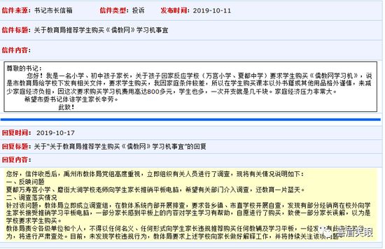 有禹州市民10月11日通过中国禹州网“书记市长信箱”发布“关于教育局推荐学生购买《儒教网》学习机事宜”称,孩子回家反映学校(万宫小学、夏都中学)要求学生购买《儒教网学习机》,说是市教育局给学校下发有相关文件,要求学生购买。因其家庭条件较差,所以对学生购买课本以外书籍或其他用品格外谨慎,以减少家庭经济负担,这次要求购买学习机费用高达800多元,学生也多。家庭经济压力非常大。