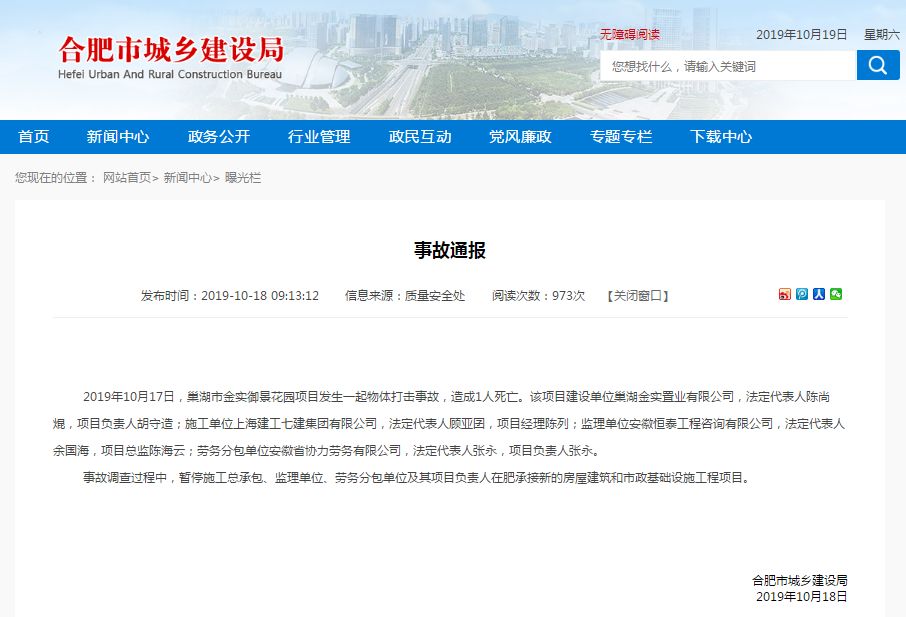 2019年10月17日,巢湖市金实御景花园项目发生一起物体打击事故,造成1人死亡。该项目建设单位巢湖金实置业有限公司,法定代表人陈尚焜,项目负责人胡守造;施工单位上海建工七建集团有限公司,法定代表人顾亚囝,项目经理陈列;监理单位安徽恒泰工程咨询有限公司,法定代表人余国海,项目总监陈海云;劳务分包单位安徽省协力劳务有限公司,法定代表人张永,项目负责人张永。