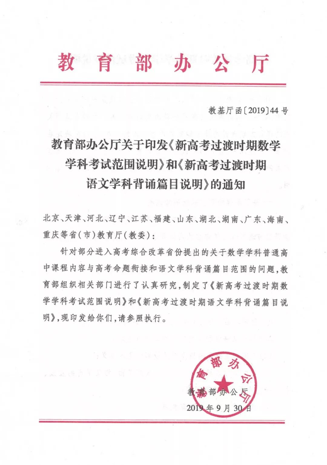 近日,教育部办公厅发布了关于印发《新高考过渡时期数学学科考试范围说明》和《新高考过渡时期语文学科背诵篇目说明》的通知: