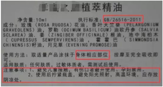 精油警示语标注不符合GB/T26516-2011的要求;执行标准格式标注错误;使用部位不明确