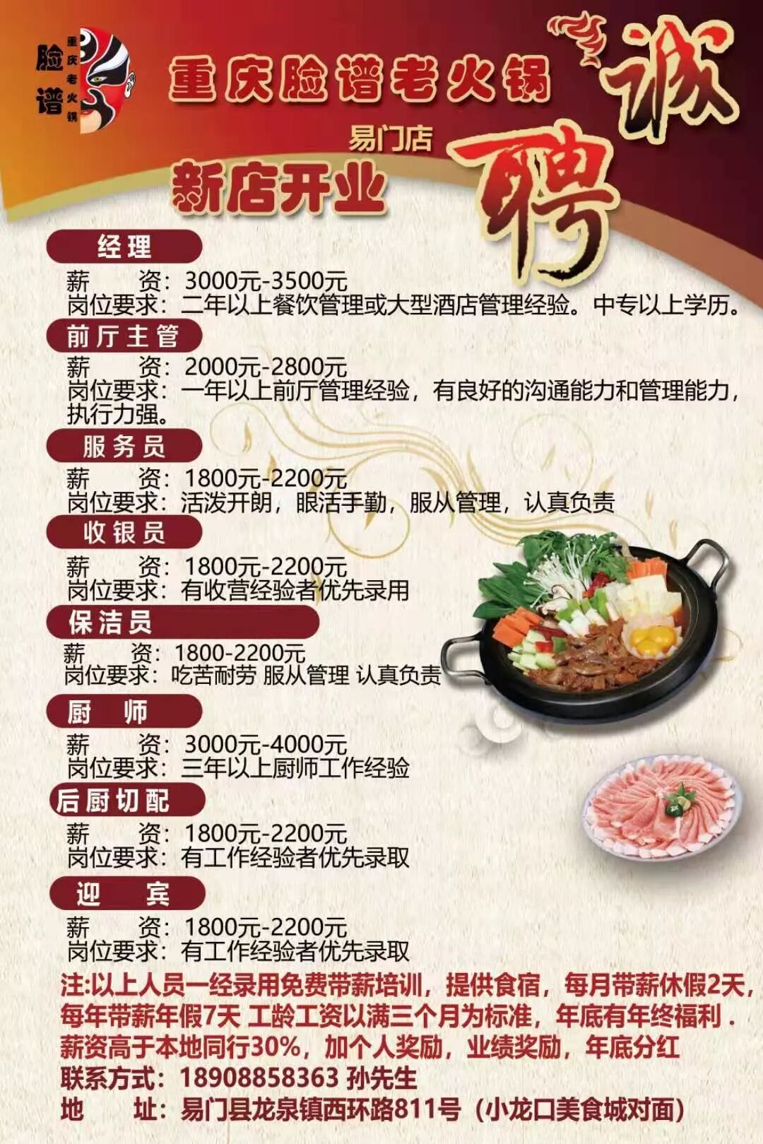 要求:会做家常菜,会做面食(包子、馒头),主要负责公司员工的一日三餐,薪资待遇从优。