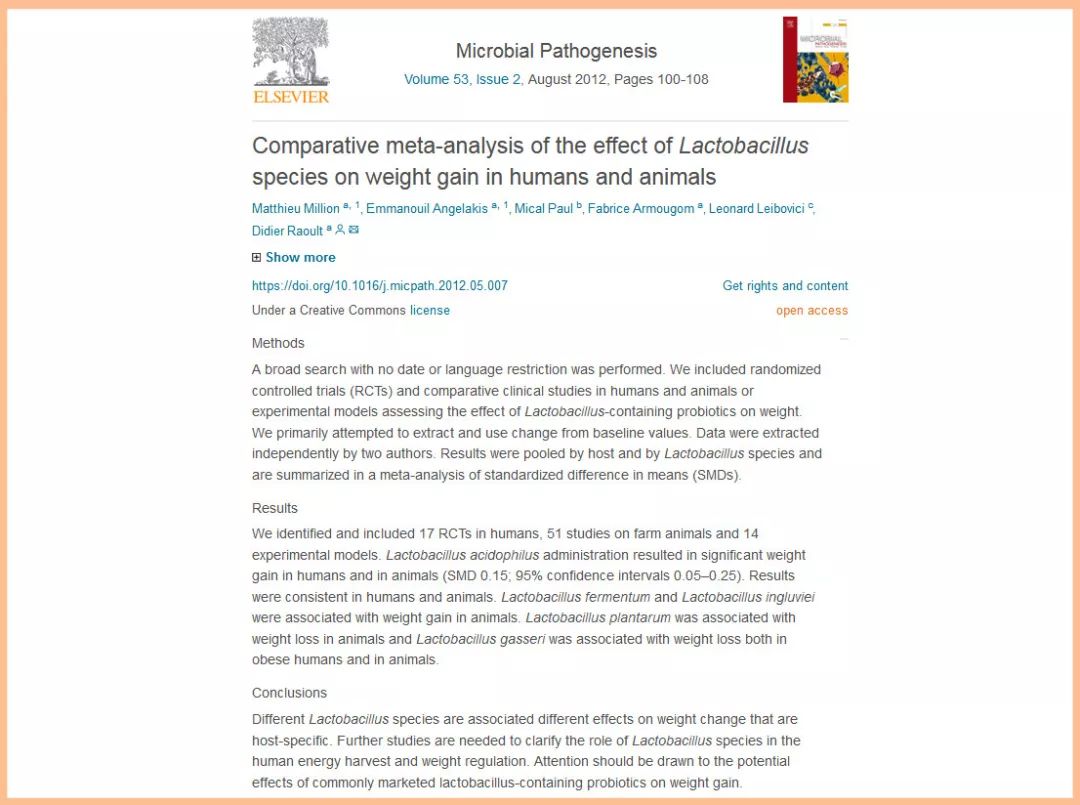 通过17种人类随机对照试验,51种动物试验,采用14种实验模型证实:“嗜酸乳杆菌”Lactobacillus acidophilus的施用导致人和动物体重显著增加,试验结果在人类和动物中一致。