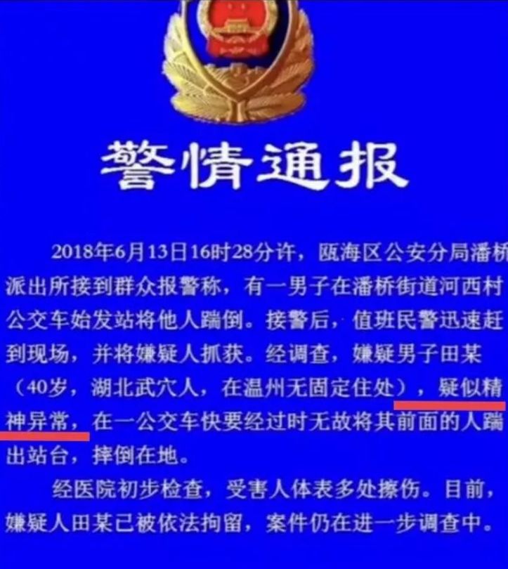 涉事男子姓田,系湖北省黄冈市人。2018年6月13日16时许,76岁的吴某在铁路温州南站公交站台候车,田某在一辆公交车即将靠站时,突然凌空一脚踹向吴某,将他踢倒在公交车道上。