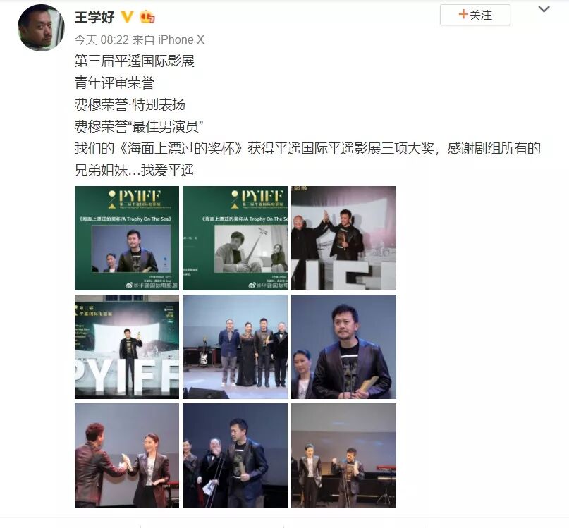 10月18日,演员王学兵在社交平台发文称在第三届平遥国际影展上,由他主演的电影《海面上漂过的奖杯》获得了平遥国际平遥影展三项大奖,并且王学兵本人还获得了费穆荣誉“最佳男演员”,这可以说是王学兵近几年来收获到的为数不多的好消息。