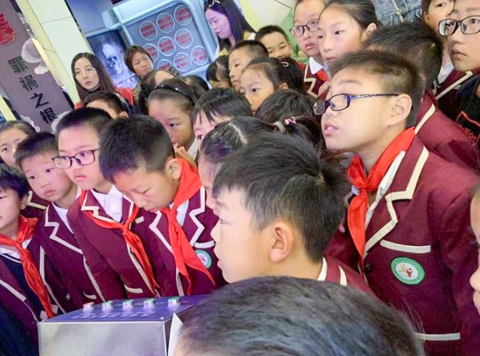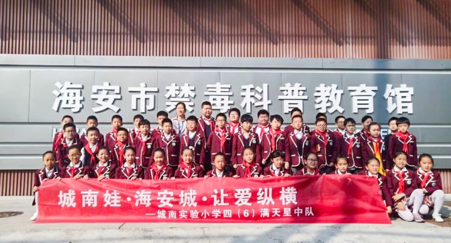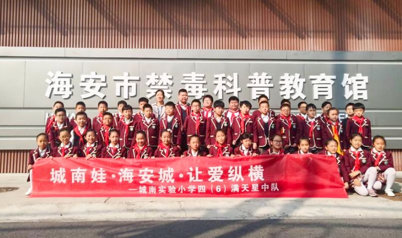 为了让小朋友们从小形成“远离毒品·关爱生命”的直观意识,10月19日上午,海安城南实小四(6)中队的全体队员身着校服、佩戴红领巾来到了海安市禁毒科普教育馆。进入教育馆之前,我们先留下了珍贵的合影,以此铭记“毒品预防,人人有责”。