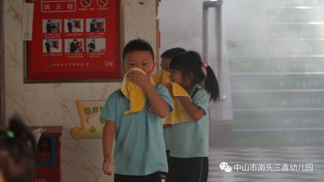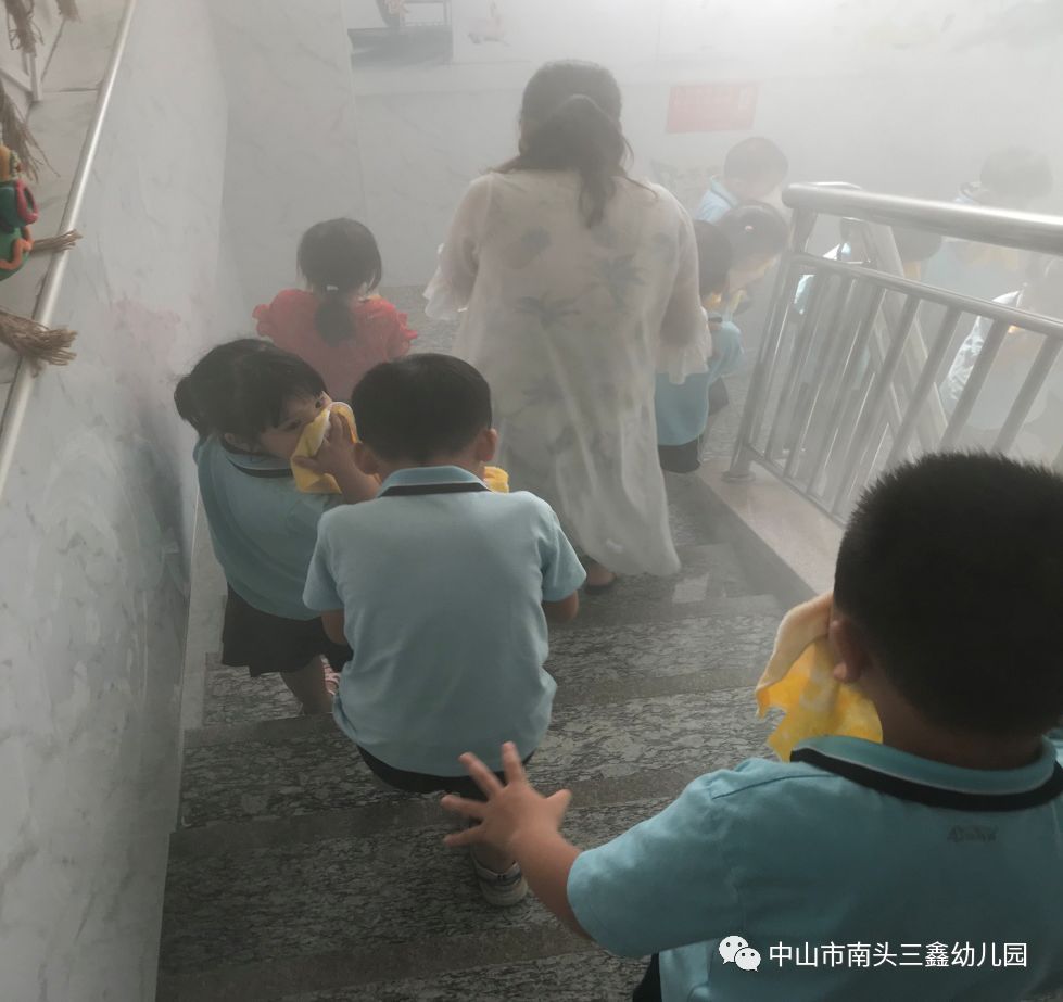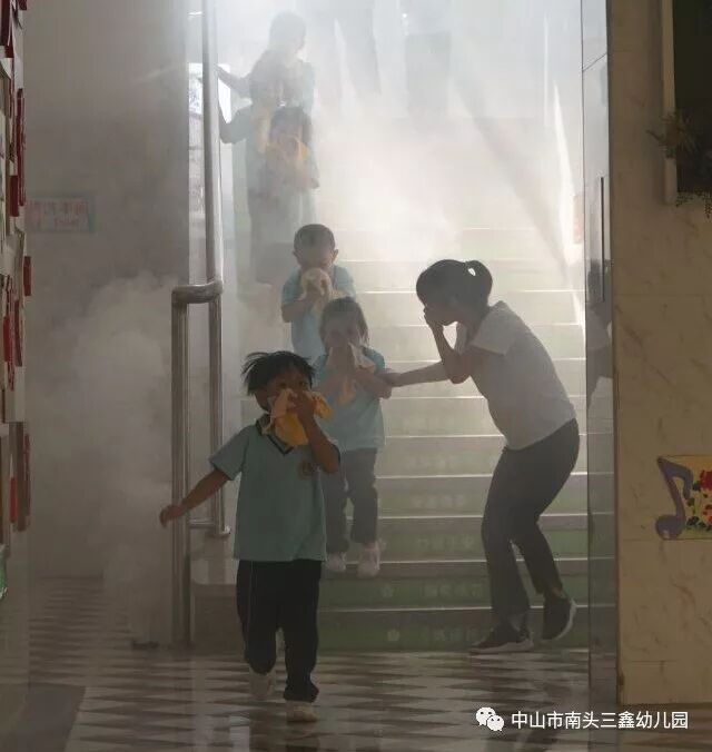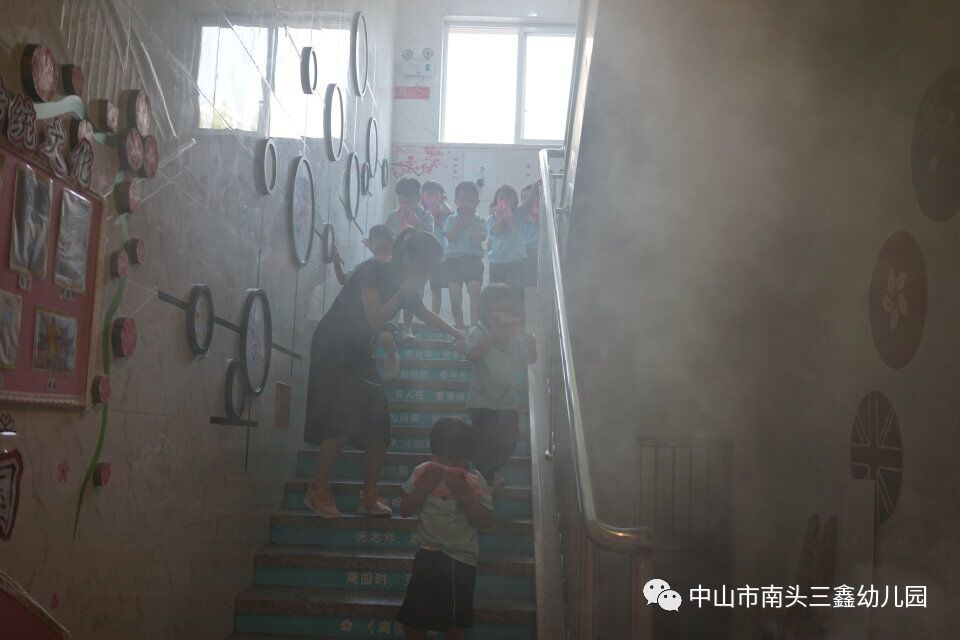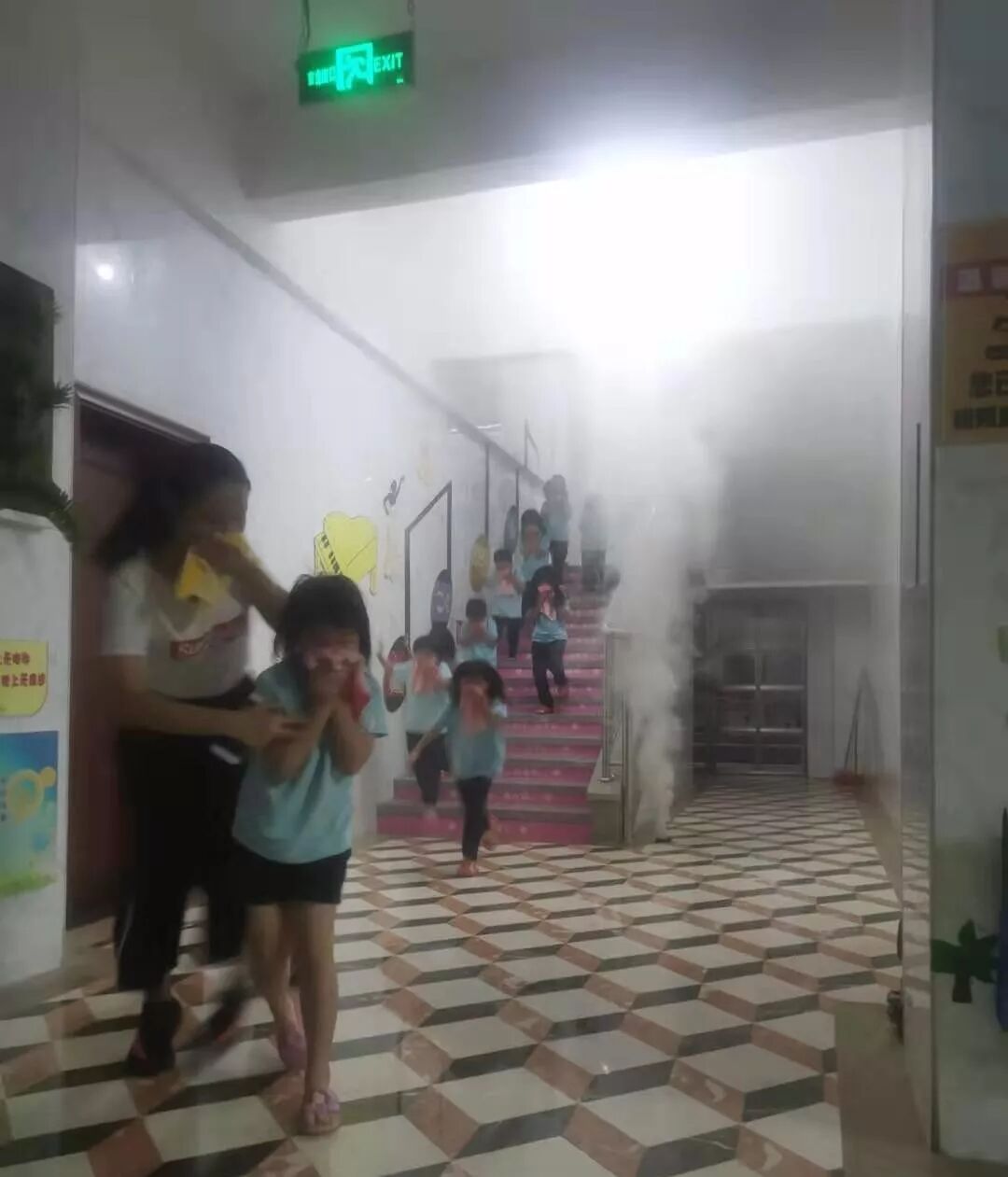 情景设置:寄宿生睡房吹风筒未关插座引发起火。2019年9月29日上午,幼儿活动室突发火灾的情况下,警报响起,全班幼儿熟悉消防逃生路线,教师迅速打湿毛巾,幼儿领取捂住口鼻两门分组撤离,生活老师楼梯拐角指引并收尾查看是否有幼儿掉队漏人,撤离安全区域后,清点人数,检查有无人员受伤。