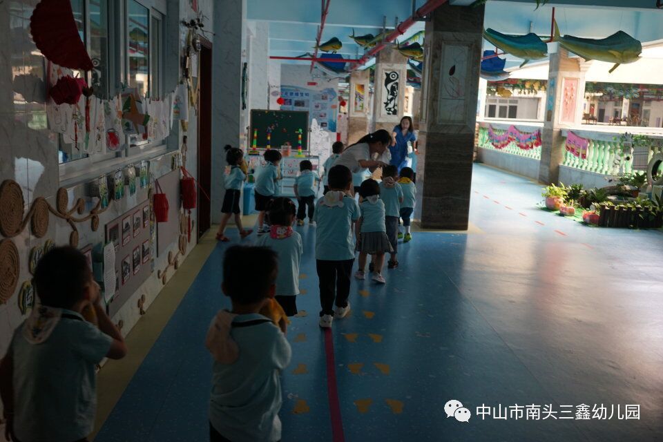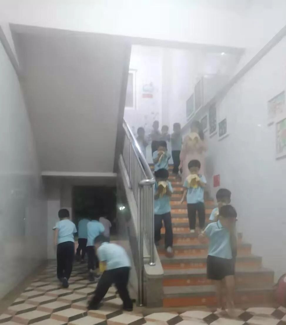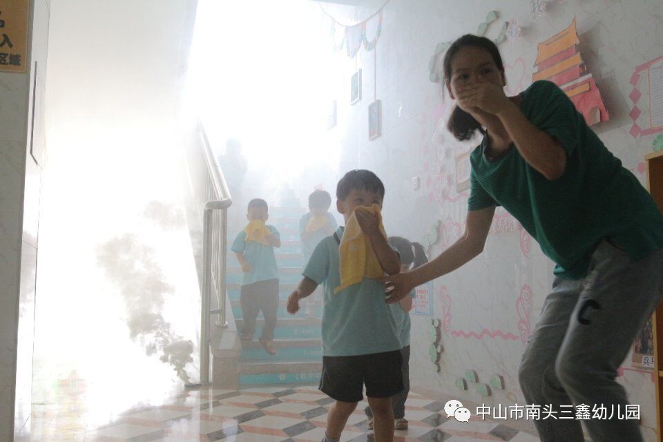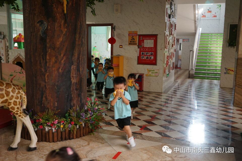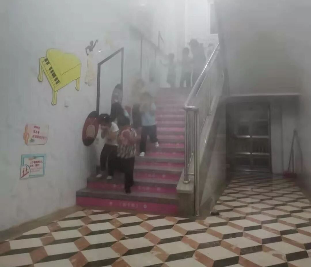 情景设置:寄宿生睡房吹风筒未关插座引发起火。2019年9月29日上午,幼儿活动室突发火灾的情况下,警报响起,全班幼儿熟悉消防逃生路线,教师迅速打湿毛巾,幼儿领取捂住口鼻两门分组撤离,生活老师楼梯拐角指引并收尾查看是否有幼儿掉队漏人,撤离安全区域后,清点人数,检查有无人员受伤。