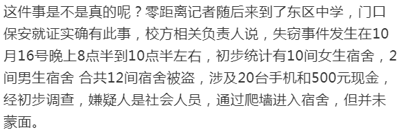 10月16号晚上8点20分左右手机就被偷了,大概20台左右,然后还有现金,听说是两个蒙面的社会青年,从宿舍后面翻墙进来偷东西。