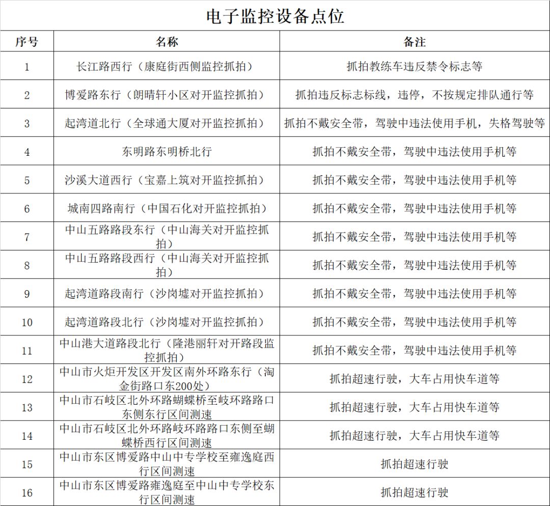 主要抓拍:违停、不礼让行人、冲禁、违反标志标线行驶,驾驶乘坐摩托车不戴头盔等交通违法行为。