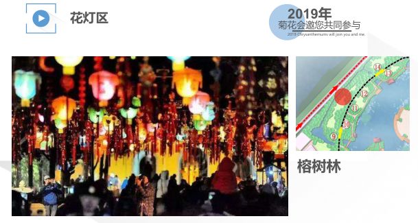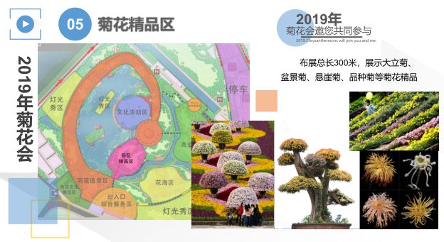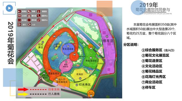 本次菊花会会场划分为菊艺造景区、菊花精品区、花海区、灯光秀区、文化展演区、美食区、创意集市区以及展览区等区域。