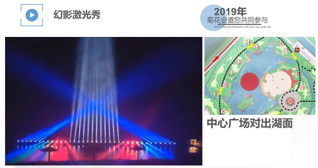 30米魔幻色彩灯光长廊、3D maping、幻影激光秀、巨型激光水幕,配合发光球、彩虹步道、互动地砖、发光动物模型,演绎出美仑美奂的菊影之夜。