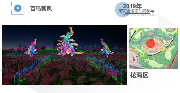 花海面积约2万平方米,其中心是一组传统灯饰造型“百鸟朝凤”,由三只凤凰及350盏小鸟灯、150盏小动物花灯组成,其中一只凤凰高达10米。四周以小菊系菊花品种及菊科菊属植物波斯菊、向日葵、皇帝菊等铺砌成色彩缤纷的凤尾。