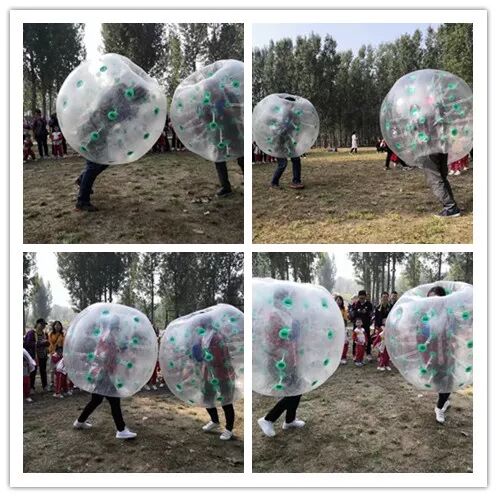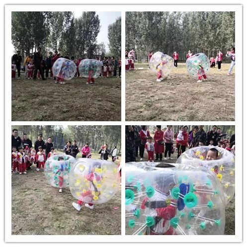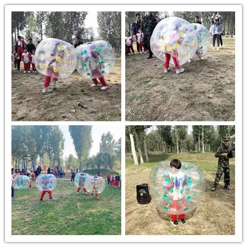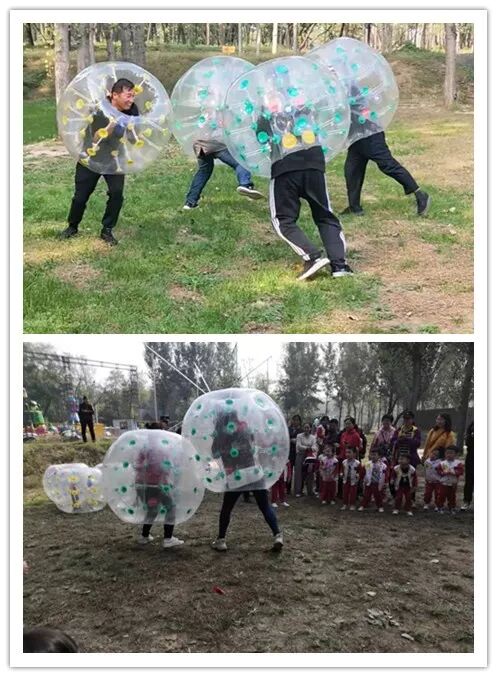 精彩刺激的碰碰球游戏开始啦,家长们率先套上充满气的气球,然后,开始一场智慧与力量角逐,教官的哨声一响,家长开始向对手碰去,场边的幼儿们不断着喊着加油,为场内的鼓劲,现场的气氛一下点燃了起来。