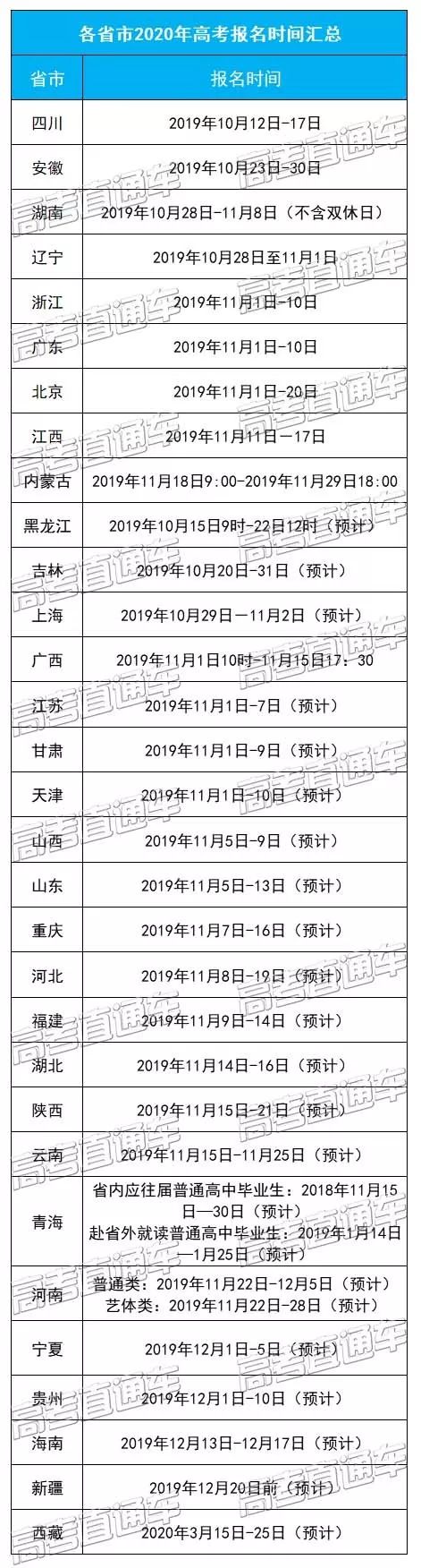 备注“预计”的为参考2019年高考的报名日期,仅供参考,具体以所在省份的教育考试院官方通知为准。