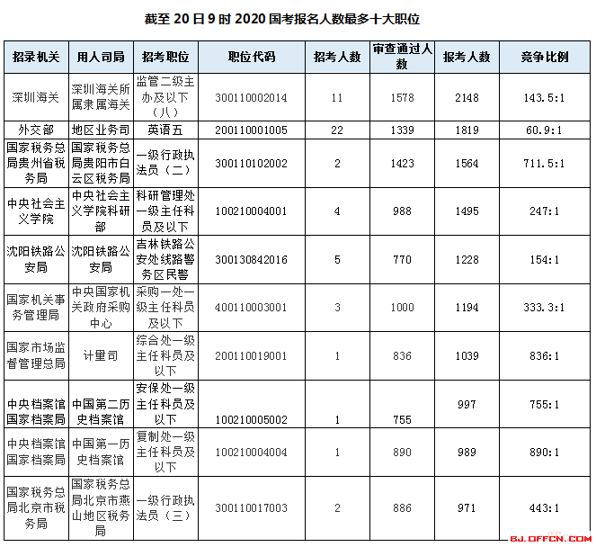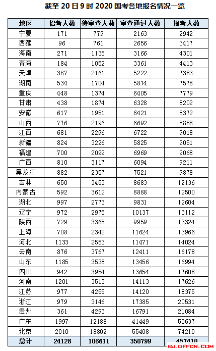 10月20日,2020国考报名进入第6天,根据中公教育上午9时统计的数据显示,报名系统共有457410人报名,350799人过审,平均竞争比14:1,仍有570个职位为人问津。