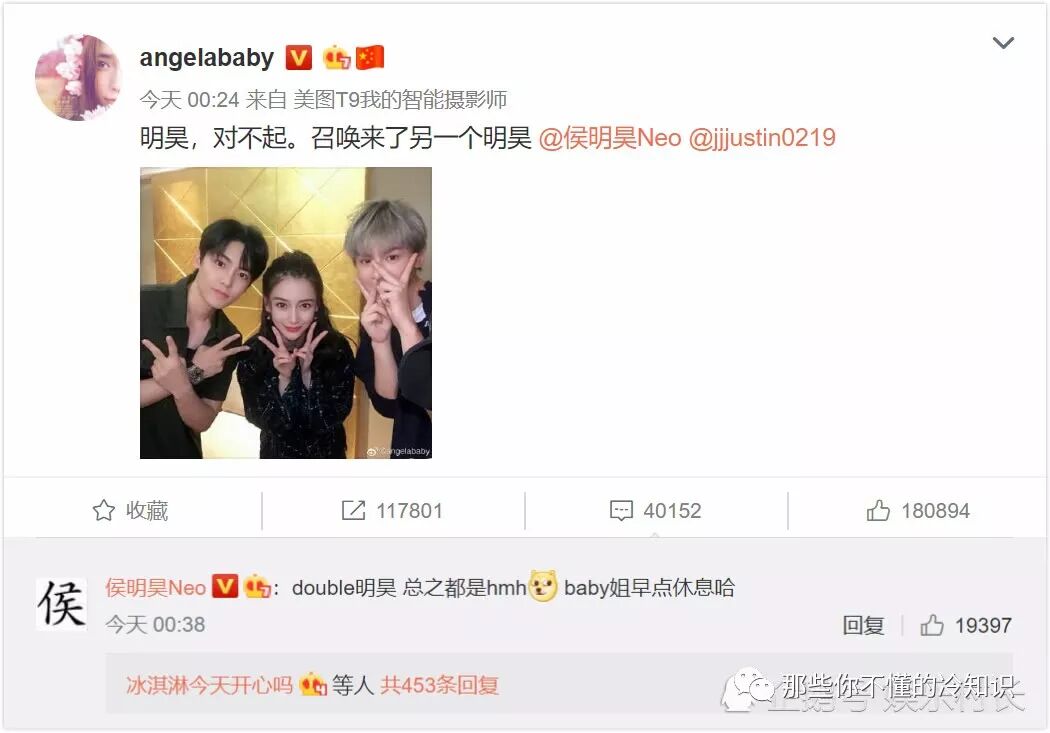 值得一提的是虽然baby非常用功的背台词,但是当晚baby主持时还是出错,那便是将侯明昊的名字念成了黄明昊,为此baby在晚会结束时专程向侯明昊道歉,并喊来了黄明昊三人一起合影。对于baby的道歉侯明昊则回复:“double明昊 总之都是hmh[doge] baby姐早点休息哈。”
