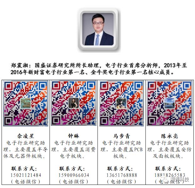 重要声明:本订阅号是国盛证券电子团队设立的。本订阅号不是国盛电子团队研究报告的发布平台。本订阅号所载的信息仅面向专业投资机构,仅供在新媒体背景下研究观点的及时交流。本订阅号所载的信息均摘编自国盛证券研究所已经发布的研究报告或者系对已发布报告的后续解读,若因对报告的摘编而产生歧义,应以报告发布当日的完整内容为准。本资料仅代表报告发布当日的判断,相关的分析意见及推测可在不发出通知的情形下做出更改,读者参考时还须及时跟踪后续最新的研究进展。