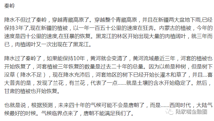 从植被的状态就知道是一个季节的对吧,看植被的覆盖量,这是陕北地区的改变,他们在采样的黄河数据是,从上游开始,泥沙含量一年一个指数级的下降,今年黄河壶口的泥沙含量已经变了,黄河携带泥沙主要是从甘肃境内开始的,甘肃已经开始恢复了,他们预估是在四十年内,降水会推进到长城以北,如果降水进长城以北了,就是西周了……