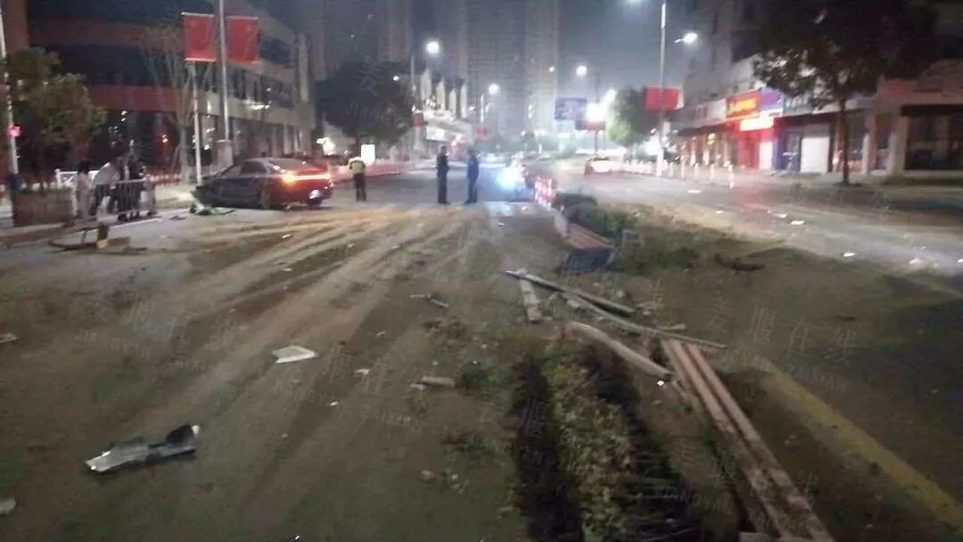 事发地点位于时代广场红绿灯南侧。凌晨1点50分左右,现场路面上一片狼藉,道路中间的6截绿化隔离护栏被撞烂,一辆蓝色“林肯”轿车斜停在道路东侧的机动车道上,严重受损变形的车头顶着路边的路灯杆,车内的安全气囊全部打开,车头前方的路面上满是油渍。姜堰交警大队和巡特警大队的民警正在现场了解情况。