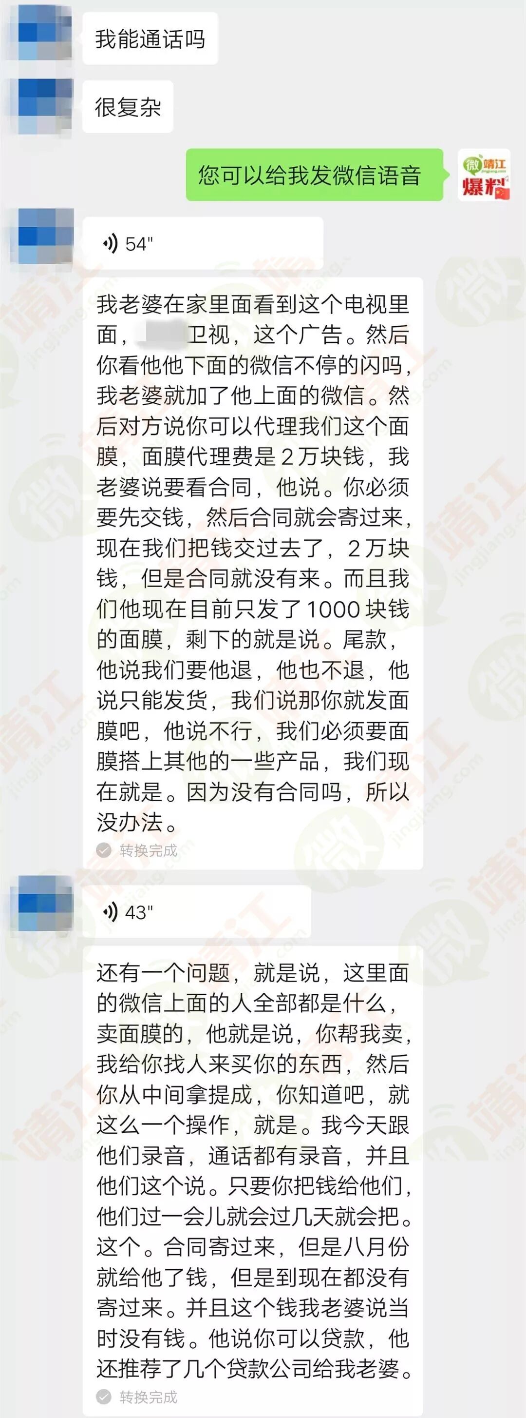 等到把钱汇过去,对方的表现与之前承诺的却判若两人,刘先生反应:合同从8月份打完钱到今天都没有寄过来;承诺的产品只发了一款面膜,而且价值才1000来块;也不继续发货,说是要发其他的产品;尾款也不肯退,就这样一直耗着。等于说前后损失了3万块!