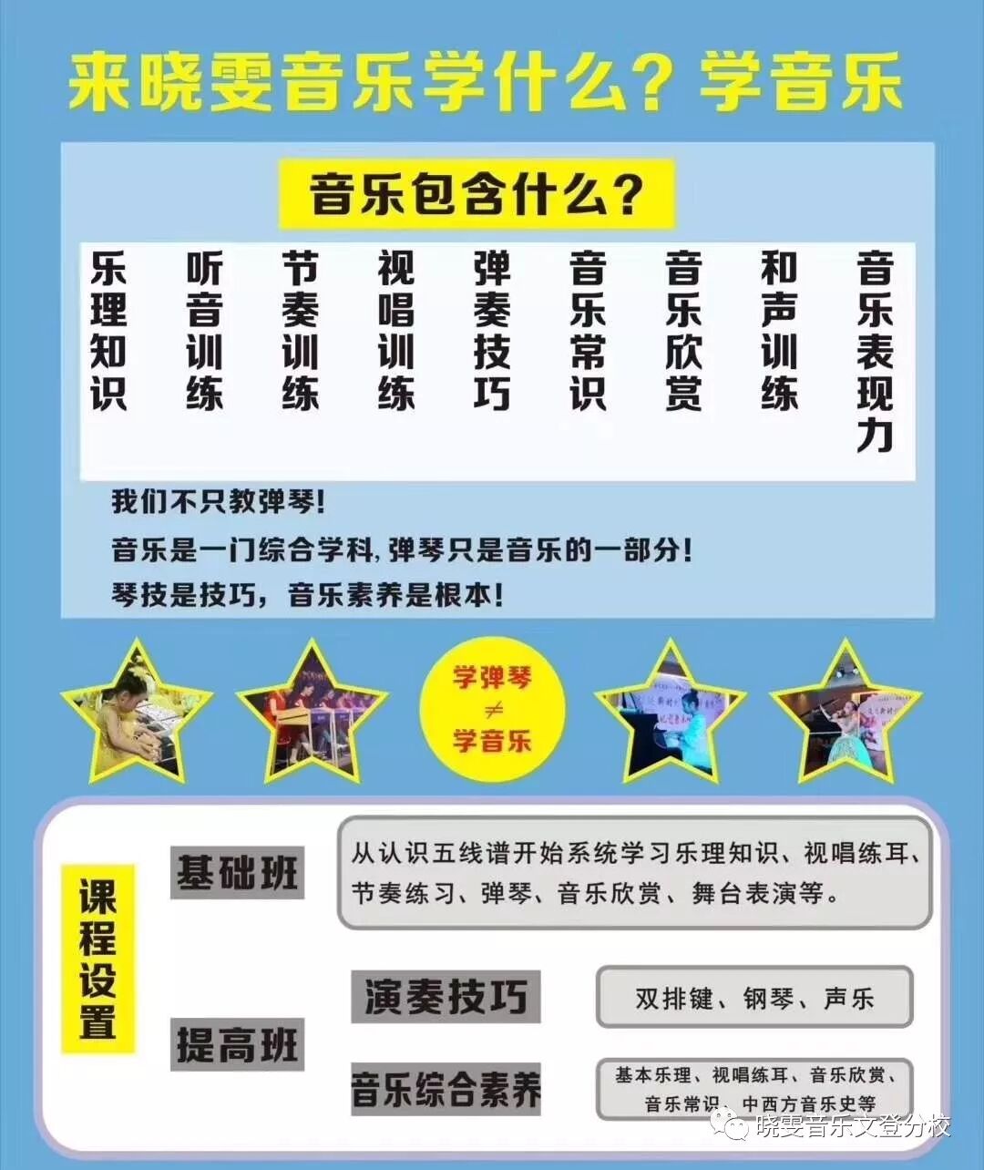 晓雯音乐学校课程设置:一、音乐基础班(基础乐理+弹奏技巧)
