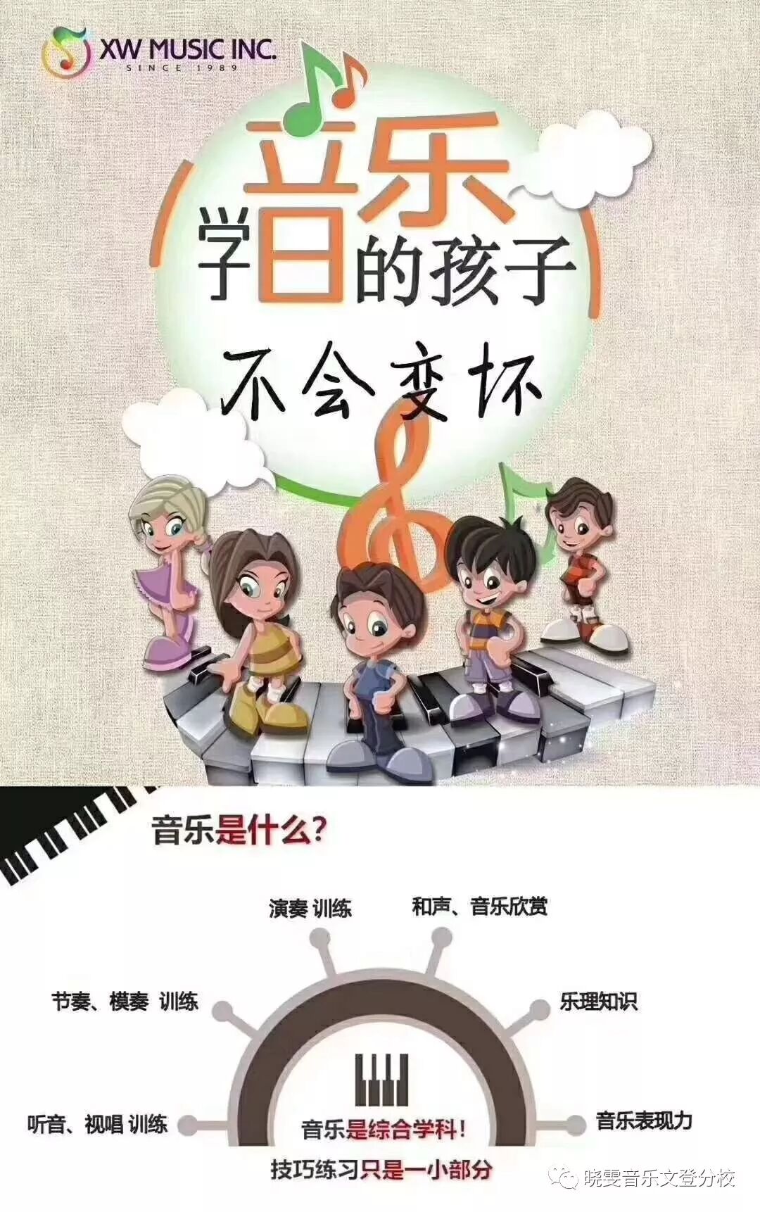 晓雯音乐学校成立于1989年9月,是一所以“普及音乐基础教育”为使命的专业、系统、规范的国际连锁音乐学校。“琴技是技巧,音乐素养是根本”“发展传统教育,紧跟国际潮流”是晓雯音乐学校坚定不渝的教学方针,在晓雯音乐学校学到的不只是弹琴技巧而已,更多的是音乐素养。技能只是短期的培训,而音乐素养会伴随着孩子一生。孩子们的文化知识和音乐素养一定是相辅相成的,晓雯音乐学校30年的办学经验和文化的沉淀给孩子们是最好的音乐教育。