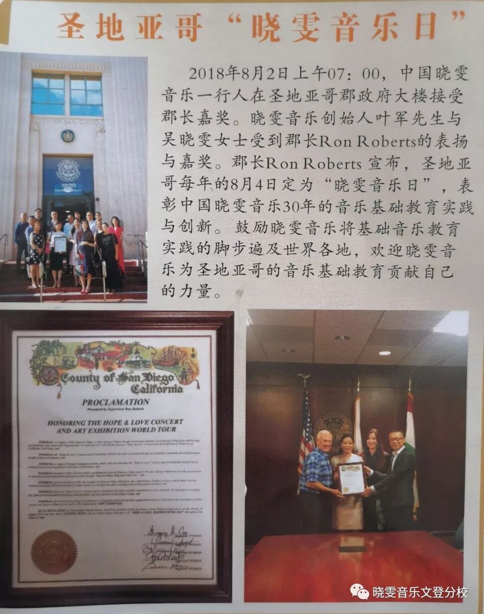 美国圣地亚哥每年8月4日定为“晓雯音乐日”