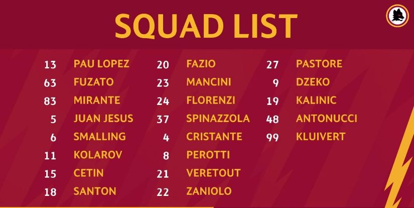 ★罗马官方公布出征热那亚的大名单,队长右闸弗洛伦齐、中锋哲科、边锋佩罗蒂伤愈回归,中场姆希塔良、洛伦佐·佩莱格里尼、迪亚瓦拉、边锋云代尔、右闸扎帕科斯塔因伤缺阵。