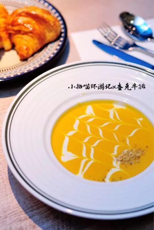 作为小吃货招妹当然不能错过啦进口高品质牛排这品质你不得不服厚厚的一块切开~纹理清晰汁多肉美牛排的香嫩简直让人无法拒绝 牛角包与南瓜汤的故事