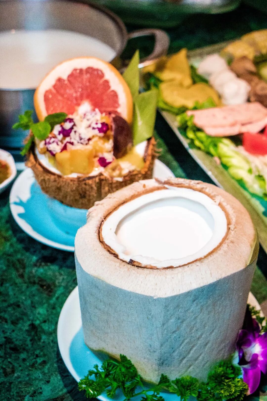 集渔用熬制了四小时的鲫鱼高汤作为汤底,再依次加入泰国香茅,香料包及秘制冬阴功酱料,最后加入现开的椰汁。