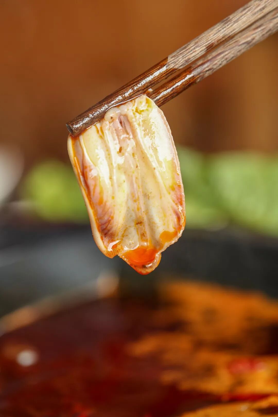 薄薄的一片甚至可以透光,下锅烫一下就立刻卷曲了!吃起来弹牙脆嫩,麻麻辣辣的,超级好吃哦!