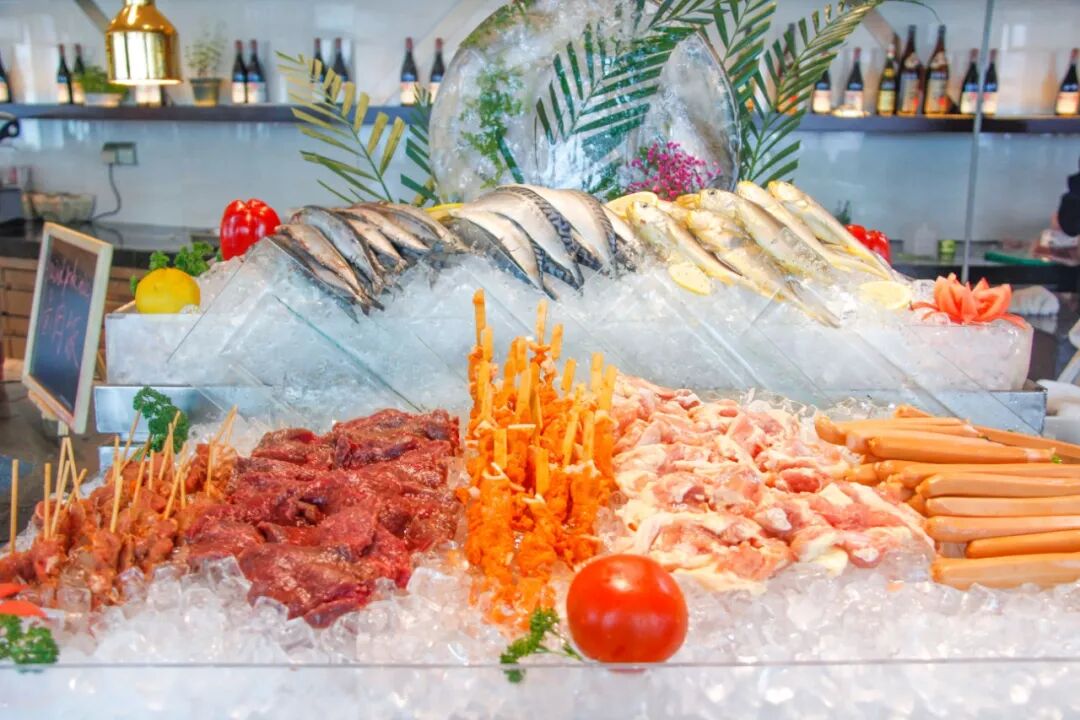 全部明档现做现吃,海鲜扒、肉类扒,应有尽有,肉串、鱿鱼、秋刀鱼...无限供应,随时补充菜品。