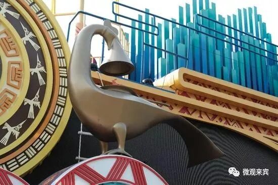 升腾的五彩绣球表达开放的广西热情欢迎八方宾客;绚丽多彩的壮锦和欢庆吉祥的铜鼓表达广西5600多万各族人民庆祝新中国成立70周年的激动心情。