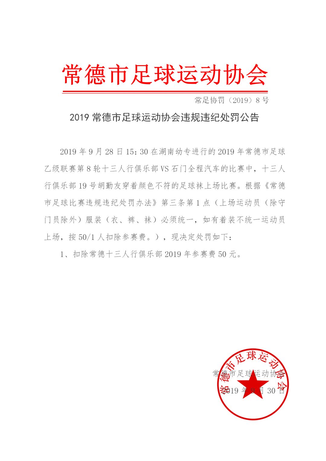 常德市足球运动协会违规违纪处罚公告(2019-08)