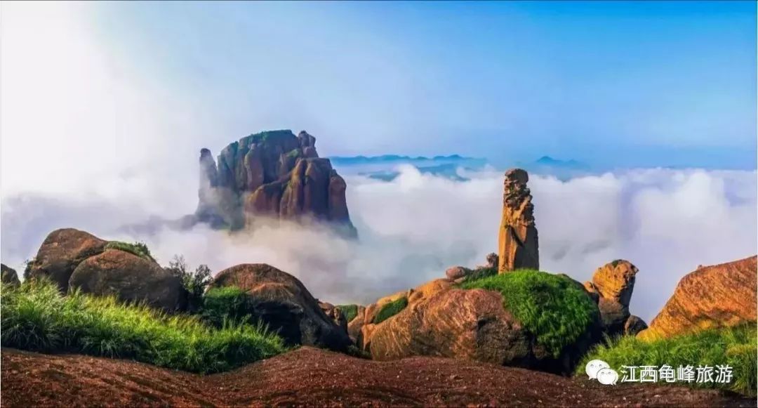 龟峰以千姿百态的龟形峰石称奇,景观集中且形态各异,有天然盆景之称谓,共三十六峰八大景。龟峰石巧峰奇,象形独秀,惟妙惟肖,享有“江上龟峰天下稀”“东方神龟乐园”“中华丹霞精品”等美誉。