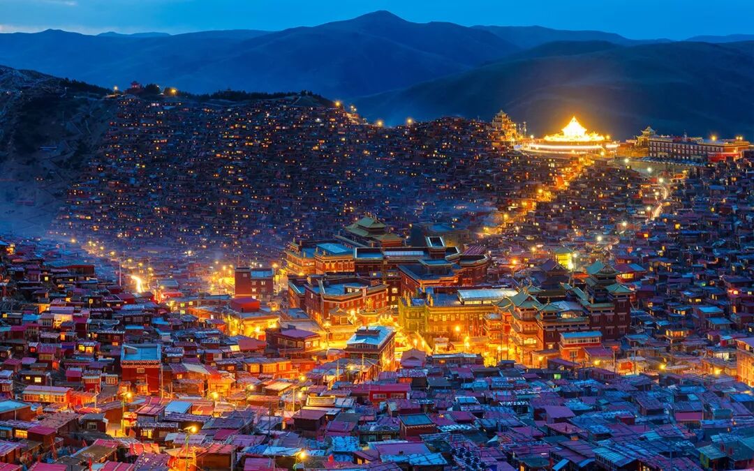 来到色达,早早睡下可不是明智的选择,站在高处看佛学院的夜色可是必不可少的仪式。傍晚的佛学院,依旧灯火通明,与黑夜中的繁星交相辉映,数千间赫红色的木屋,如众星拱月般簇拥着几座金碧辉煌的大殿,庙宇之间,灯火燃成一条通路......