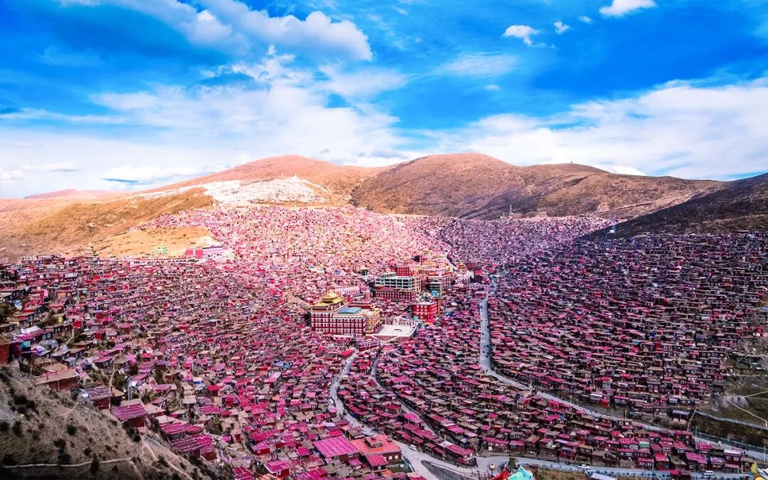色达喇荣五明佛学院是世界上最大的藏传佛教佛学院,不计其数的绛红色小木屋,密密麻麻铺满了山坡,在这片清静之地,随处可见身披绛红色僧袍的喇嘛和觉姆,他们一天到晚只做一件事,便是修行。