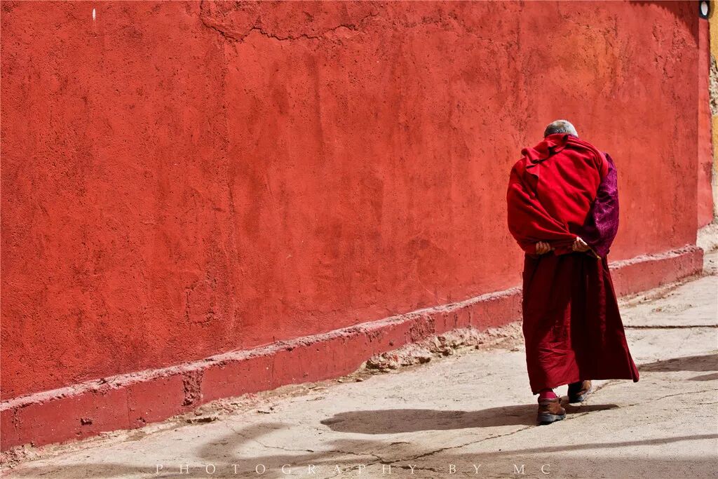 身着桨红色僧袍的喇嘛和尼姑来来往往穿梭其中,金色转经筒每一下转动,都会留下一串悠长的嘎吱嘎吱的响声,内心满是平和与生机......