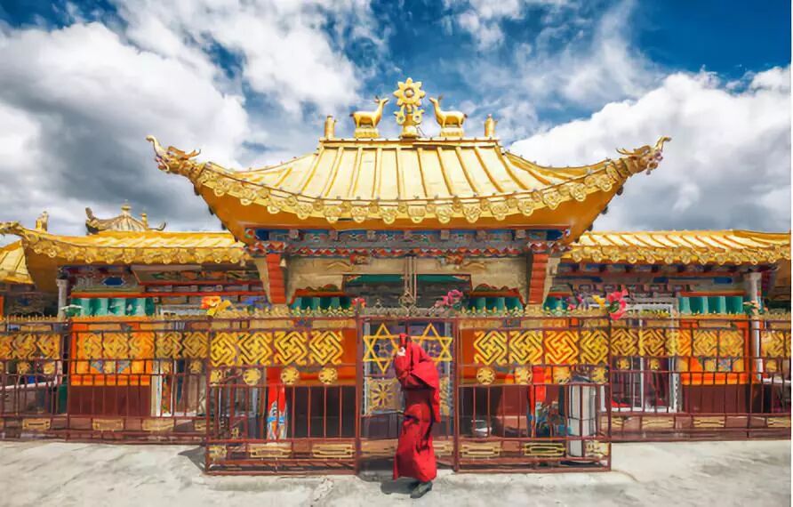 红色墙体金色屋顶的建筑,在蓝天白云的映衬下,显得格外肃静。