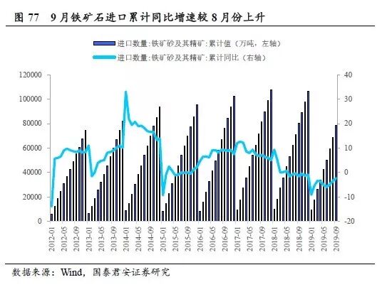 铁矿石进口累计同比增速较8月份下降。2019年9月,我国铁矿石进口累计78413.6万吨,同比下降2.4%,2019年8月份同比增速为-3.5%,增速上升1.1个百分点。